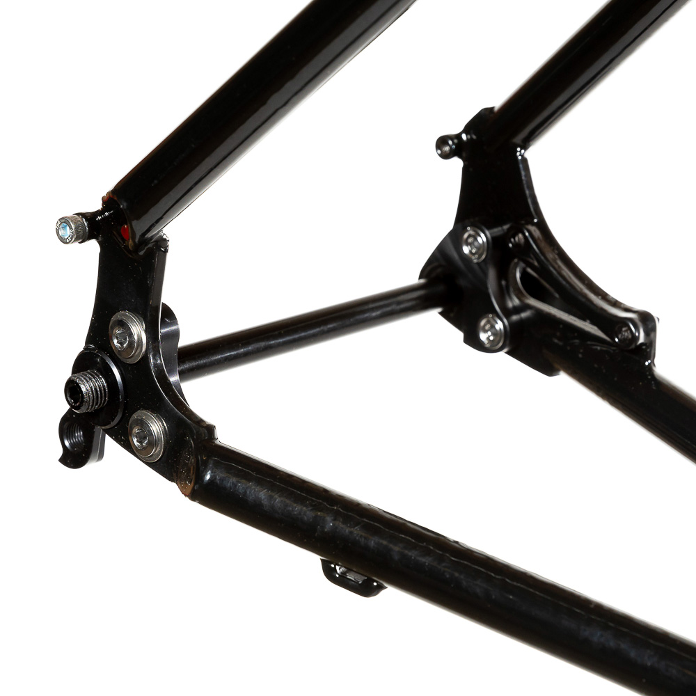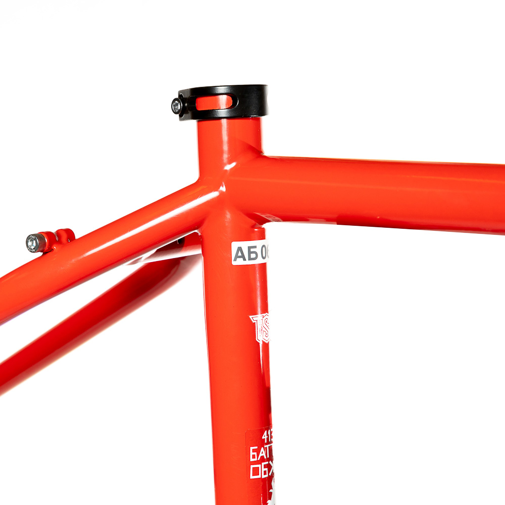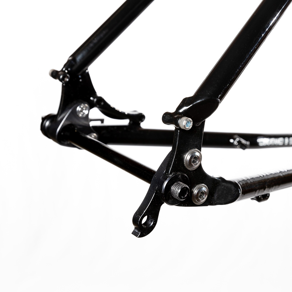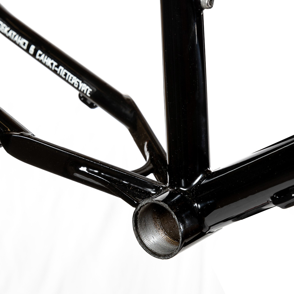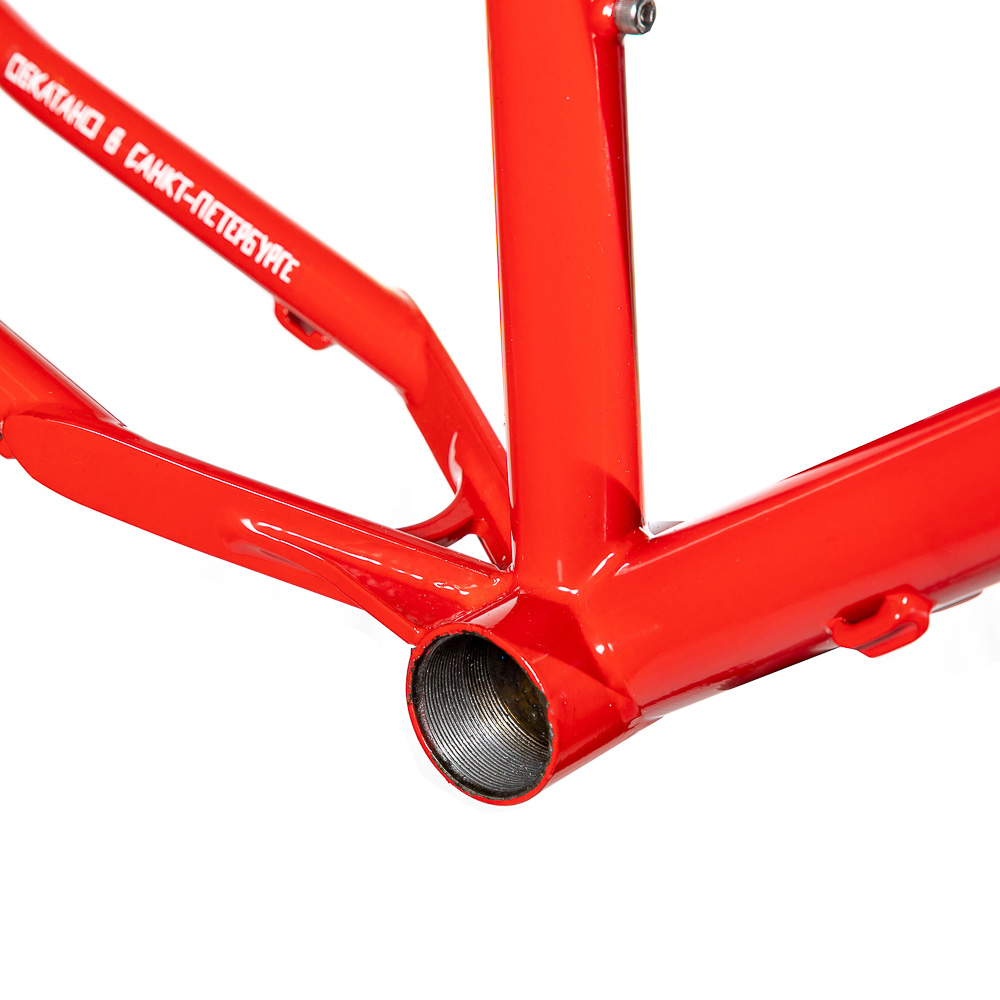 Рама для любителей туризма и приключений, сделанная в России для наших суровых погодных и дорожных условий. Такой стиль катания сейчас называют модным словом «адвенчур». В это понятие входит очень много чего, вплоть до легких трейлов. В нашем случае это рама не для экстрима, но легкий трейл без дропов на него можно проехать с удовольствием. Рассчитана она под установку жесткой вилки с высотой 485 мм, такую мы продаем отдельно. Можно ставить и аммо вилку с ходом 100 мм. Зазоры позволяют с уверенностью поставить резину 29х2,8, а в отдельных случая даже 3,0 в зависимости от ширины обода, но зазоров будет уже маловато. На раме имеются крепления под багажник на верних перьях и дропаутах, что увеличивает прочность этого узла. Также все крепления приварены, а не припаяны, так что их не оторвет с куском трубы. Сами трубы это микс из проката для разных дисциплин. Сделано это для увеличения жесткости, прочности и наката вашего велосипеда. Передний треугольник сделан из дважды и трижды баттированных кастом труб хромо 4130 с термообработкой, рулевой стакан стандарта zs44, а точнее в сток рама поставляется с рулевой ec44 под шток 1.1/8, а при замене нижней чашки на ex44 устанавливается вилка с коническим штоком. Задний треугольник сделан из труб, которые мы используем для BMX велосипедов и это феноменально улучшает жесткость рамы и ее накат. Подкова имеет симметричную форму и внушительные зазоры, при этом оставаясь в рамках BSA каретки шириной 73 мм. Подседельная труба имеет диаметр 29,8 мм под штырь 27,2 мм. Дропауты под boost 148x12 мм со сквозной осью. Зажим, дропауты, ось и рулевая под 1.1/8 поставляются в комплекте с рамой. Сами дропауты мы изобрели, опираясь на опыт клиентов нашей мастерской. Мы просто собрали воедино пазл из обломков дропаутов и рам, которые нам приносят на ремонт и сделали свои дропауты на века. Это 5 мм стальной лист с опорным креплением для съемных, фрезерованных алюминиевых вставок с фиксаторами на двух бонках. Таким образом мы ушли от стыка алюминиевой оси в стальном дропауте, что часто приводит к закисанию оси. Также обилие металла, как на раме, так и на самих дропаутах защищает их от глупых поломок.