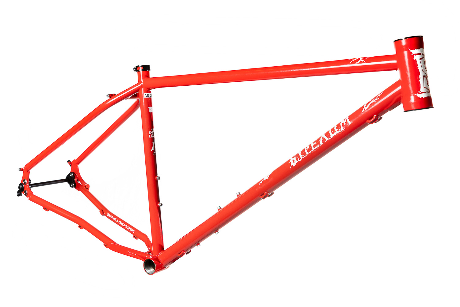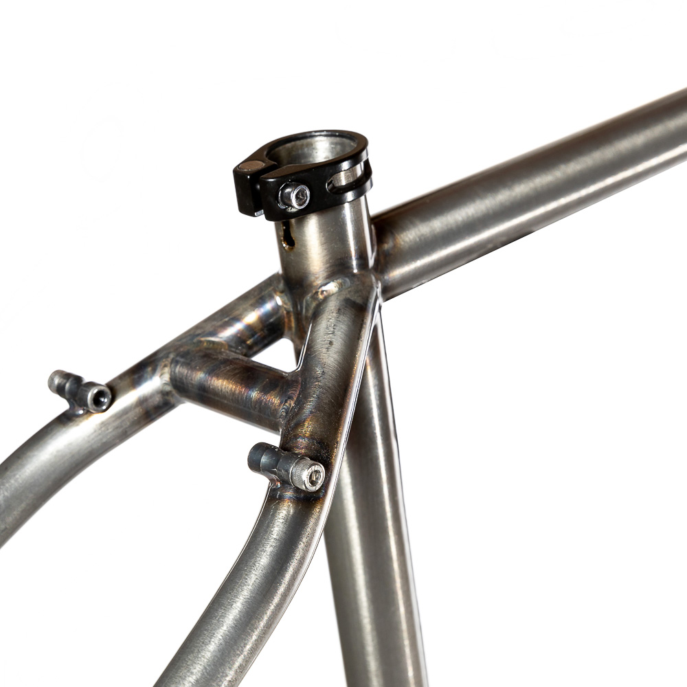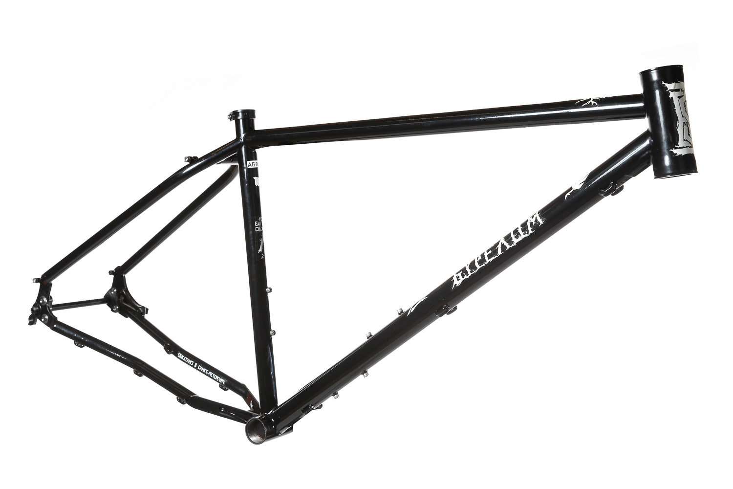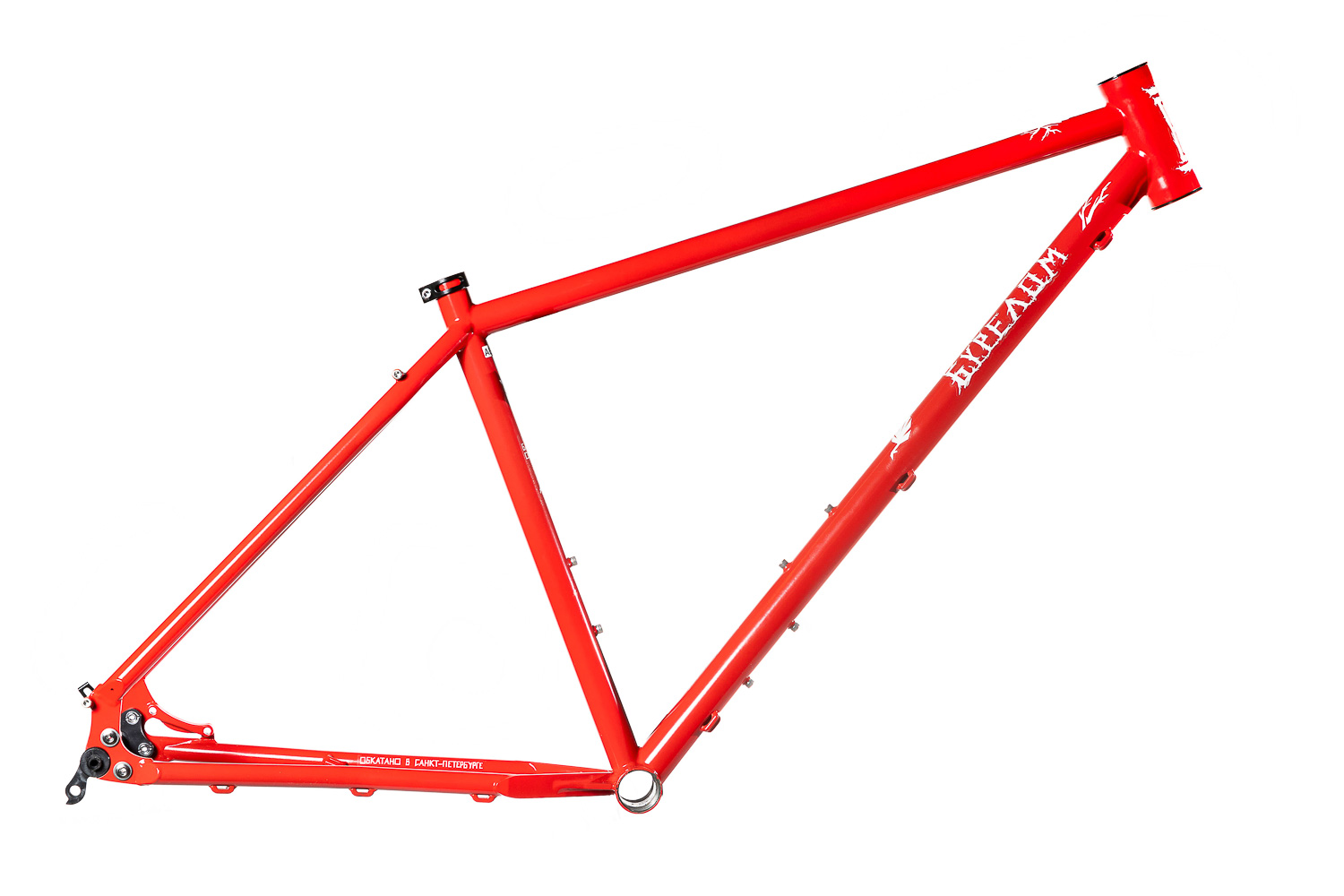 Рама для любителей туризма и приключений, сделанная в России для наших суровых погодных и дорожных условий. Такой стиль катания сейчас называют модным словом «адвенчур». В это понятие входит очень много чего, вплоть до легких трейлов. В нашем случае это рама не для экстрима, но легкий трейл без дропов на него можно проехать с удовольствием. Рассчитана она под установку жесткой вилки с высотой 485 мм, такую мы продаем отдельно. Можно ставить и аммо вилку с ходом 100 мм. Зазоры позволяют с уверенностью поставить резину 29х2,8, а в отдельных случая даже 3,0 в зависимости от ширины обода, но зазоров будет уже маловато. На раме имеются крепления под багажник на верних перьях и дропаутах, что увеличивает прочность этого узла. Также все крепления приварены, а не припаяны, так что их не оторвет с куском трубы. Сами трубы это микс из проката для разных дисциплин. Сделано это для увеличения жесткости, прочности и наката вашего велосипеда. Передний треугольник сделан из дважды и трижды баттированных кастом труб хромо 4130 с термообработкой, рулевой стакан стандарта zs44, а точнее в сток рама поставляется с рулевой ec44 под шток 1.1/8, а при замене нижней чашки на ex44 устанавливается вилка с коническим штоком. Задний треугольник сделан из труб, которые мы используем для BMX велосипедов и это феноменально улучшает жесткость рамы и ее накат. Подкова имеет симметричную форму и внушительные зазоры, при этом оставаясь в рамках BSA каретки шириной 73 мм. Подседельная труба имеет диаметр 29,8 мм под штырь 27,2 мм. Дропауты под boost 148x12 мм со сквозной осью. Зажим, дропауты, ось и рулевая под 1.1/8 поставляются в комплекте с рамой. Сами дропауты мы изобрели, опираясь на опыт клиентов нашей мастерской. Мы просто собрали воедино пазл из обломков дропаутов и рам, которые нам приносят на ремонт и сделали свои дропауты на века. Это 5 мм стальной лист с опорным креплением для съемных, фрезерованных алюминиевых вставок с фиксаторами на двух бонках. Таким образом мы ушли от стыка алюминиевой оси в стальном дропауте, что часто приводит к закисанию оси. Также обилие металла, как на раме, так и на самих дропаутах защищает их от глупых поломок.