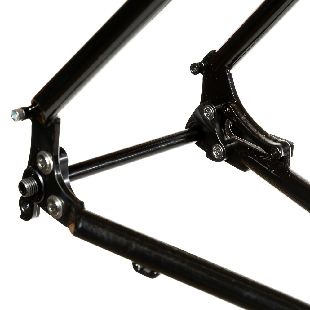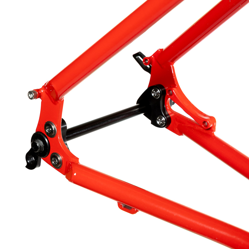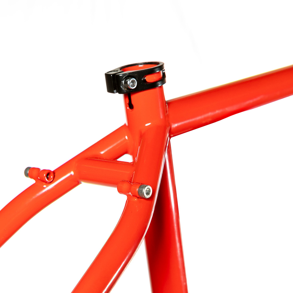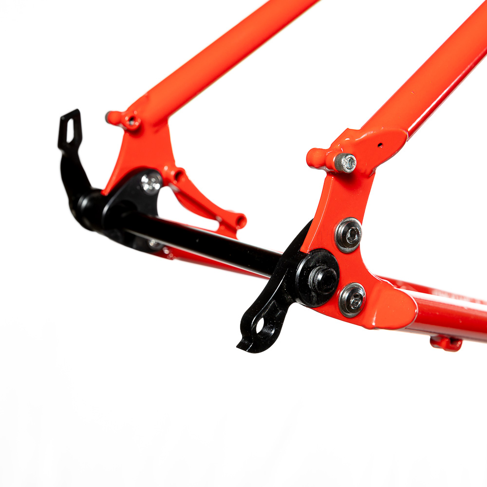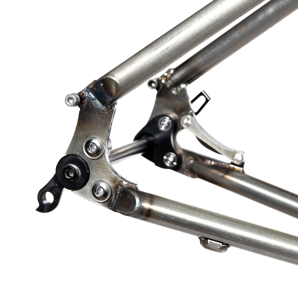 Рама для любителей туризма и приключений, сделанная в России для наших суровых погодных и дорожных условий. Такой стиль катания сейчас называют модным словом «адвенчур». В это понятие входит очень много чего, вплоть до легких трейлов. В нашем случае это рама не для экстрима, но легкий трейл без дропов на него можно проехать с удовольствием. Рассчитана она под установку жесткой вилки с высотой 485 мм, такую мы продаем отдельно. Можно ставить и аммо вилку с ходом 100 мм. Зазоры позволяют с уверенностью поставить резину 29х2,8, а в отдельных случая даже 3,0 в зависимости от ширины обода, но зазоров будет уже маловато. На раме имеются крепления под багажник на верних перьях и дропаутах, что увеличивает прочность этого узла. Также все крепления приварены, а не припаяны, так что их не оторвет с куском трубы. Сами трубы это микс из проката для разных дисциплин. Сделано это для увеличения жесткости, прочности и наката вашего велосипеда. Передний треугольник сделан из дважды и трижды баттированных кастом труб хромо 4130 с термообработкой, рулевой стакан стандарта zs44, а точнее в сток рама поставляется с рулевой ec44 под шток 1.1/8, а при замене нижней чашки на ex44 устанавливается вилка с коническим штоком. Задний треугольник сделан из труб, которые мы используем для BMX велосипедов и это феноменально улучшает жесткость рамы и ее накат. Подкова имеет симметричную форму и внушительные зазоры, при этом оставаясь в рамках BSA каретки шириной 73 мм. Подседельная труба имеет диаметр 29,8 мм под штырь 27,2 мм. Дропауты под boost 148x12 мм со сквозной осью. Зажим, дропауты, ось и рулевая под 1.1/8 поставляются в комплекте с рамой. Сами дропауты мы изобрели, опираясь на опыт клиентов нашей мастерской. Мы просто собрали воедино пазл из обломков дропаутов и рам, которые нам приносят на ремонт и сделали свои дропауты на века. Это 5 мм стальной лист с опорным креплением для съемных, фрезерованных алюминиевых вставок с фиксаторами на двух бонках. Таким образом мы ушли от стыка алюминиевой оси в стальном дропауте, что часто приводит к закисанию оси. Также обилие металла, как на раме, так и на самих дропаутах защищает их от глупых поломок.