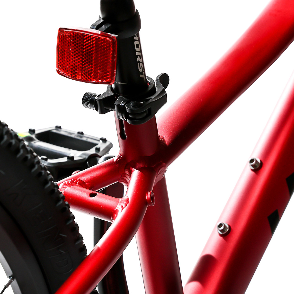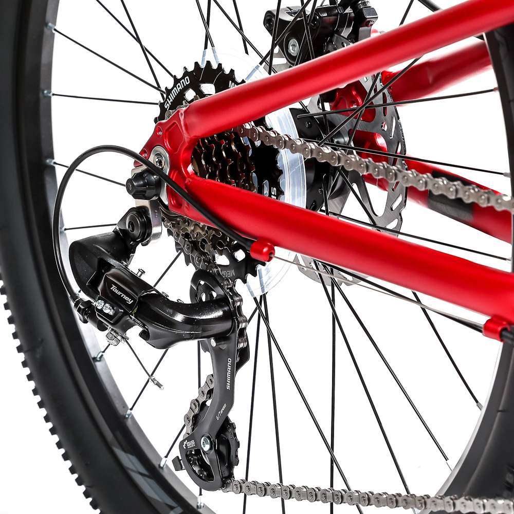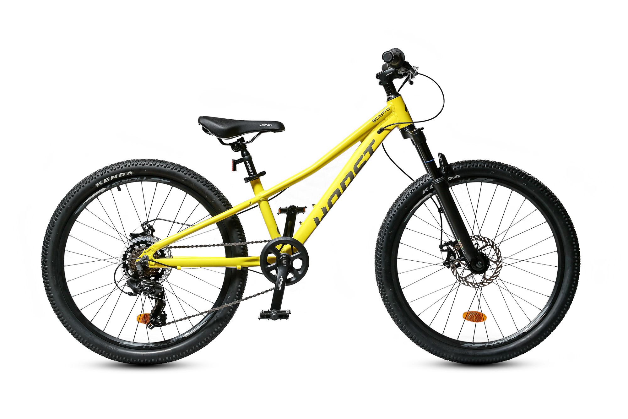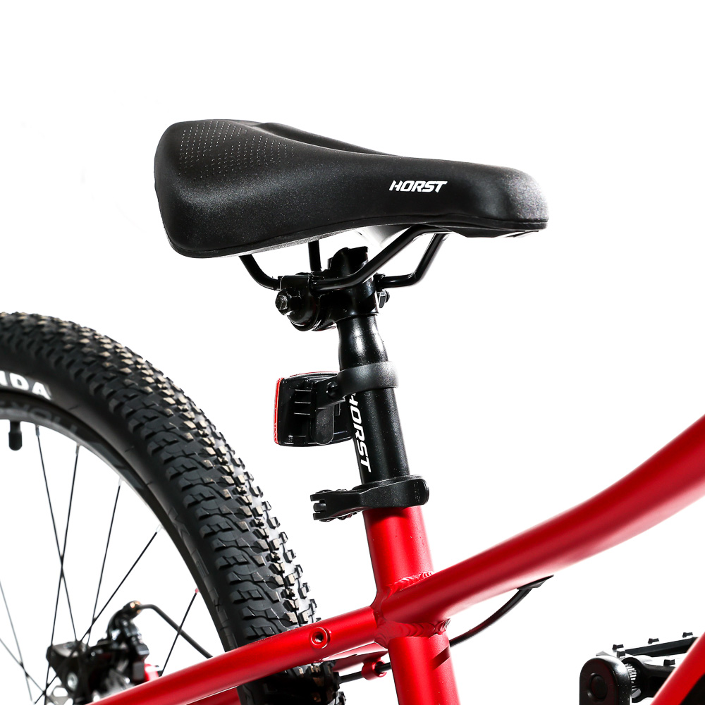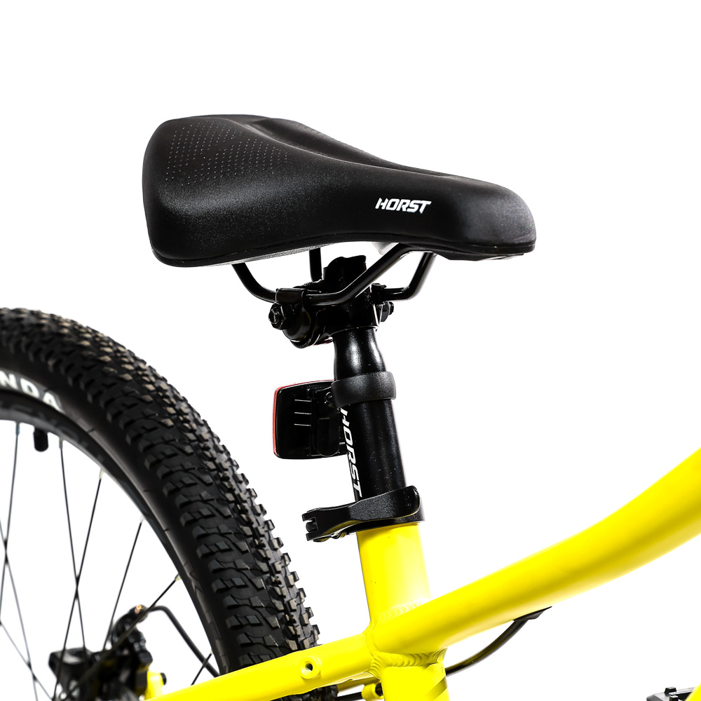 Подростковый горный велосипед Horst Scarto 2026 предназначен для юных катальщиков и спортсменов, предпочитающих несложное катание в городе, в парках и на даче. Легкая алюминиевая рама из сплава 6061, амортизатор для увеличения комфорта и управляемости. 24-дюймовые колеса собраны на прочных двойных ободах и обуты в широкую для такого диаметра колес резину Kenda шириной 2.1 дюйма. Трансмиссия на 7 скоростей – уровня Shimano Tourney. Дисковые механические тормоза Yinxing обеспечивают хорошую мощность торможения в любых дорожных условиях.