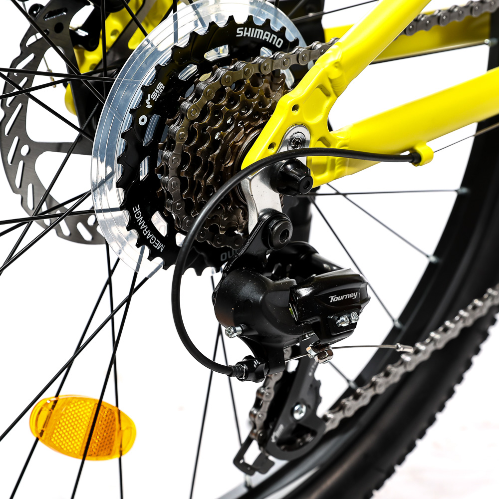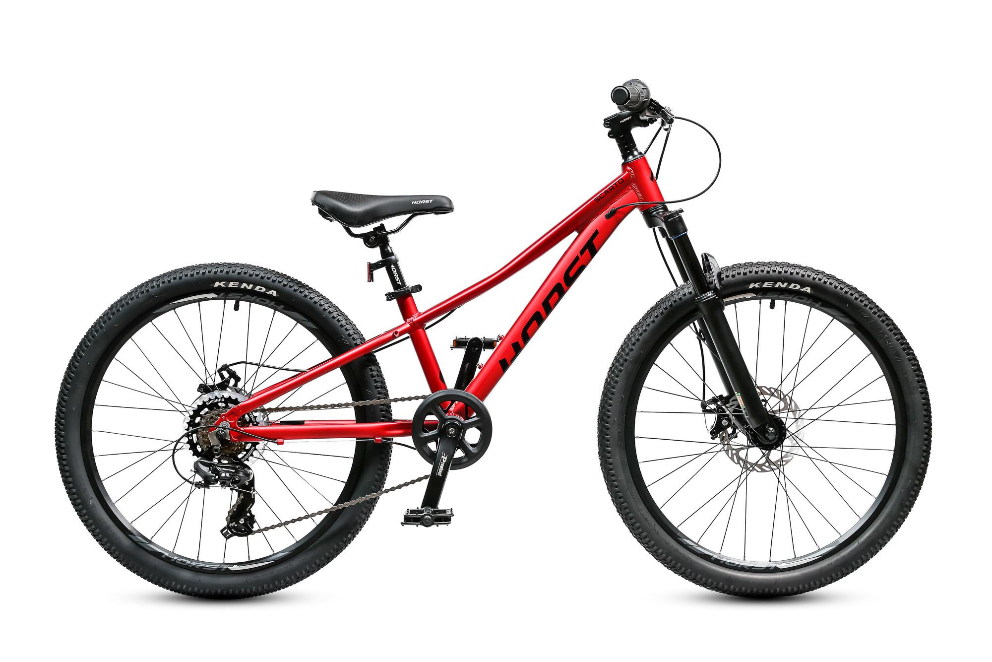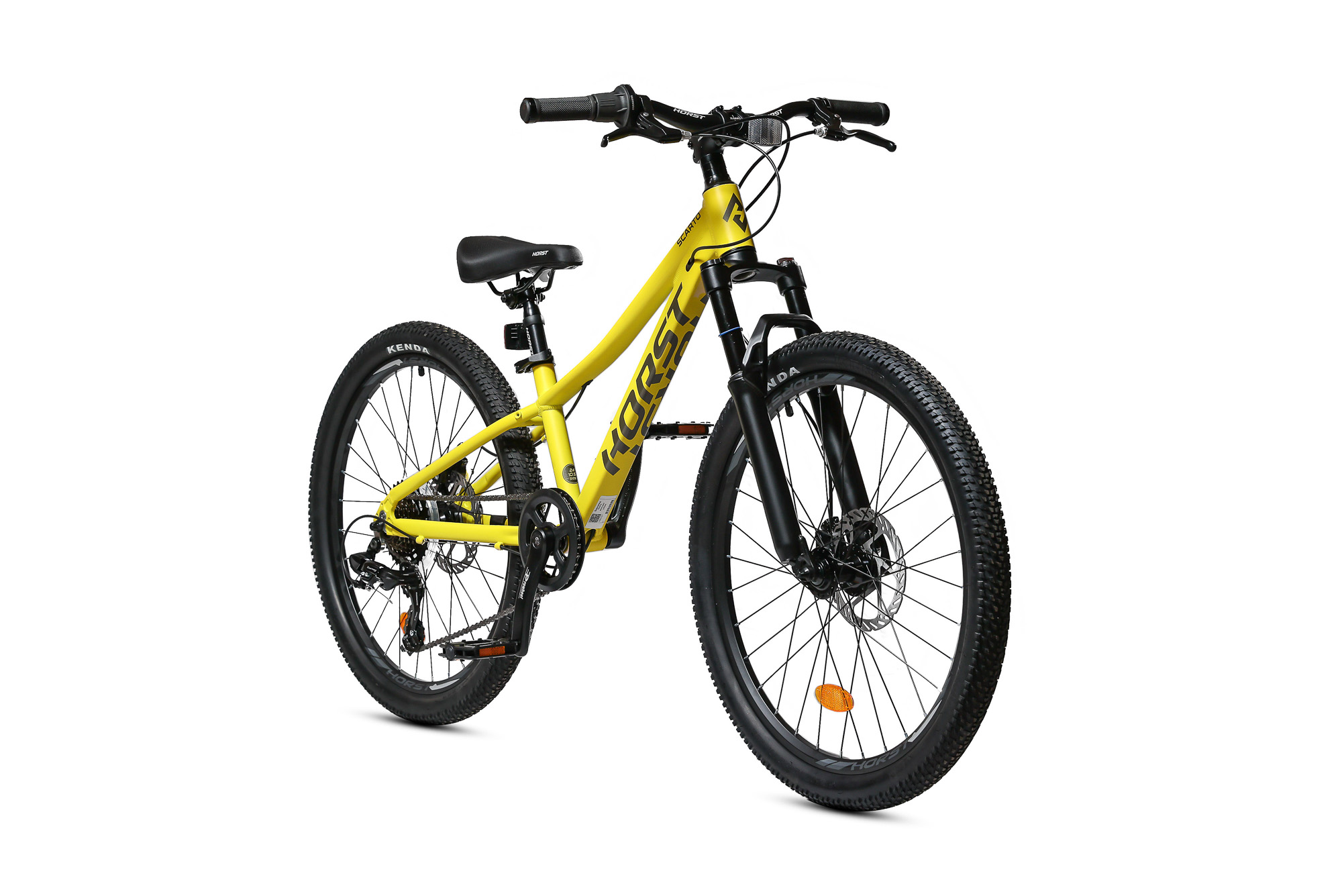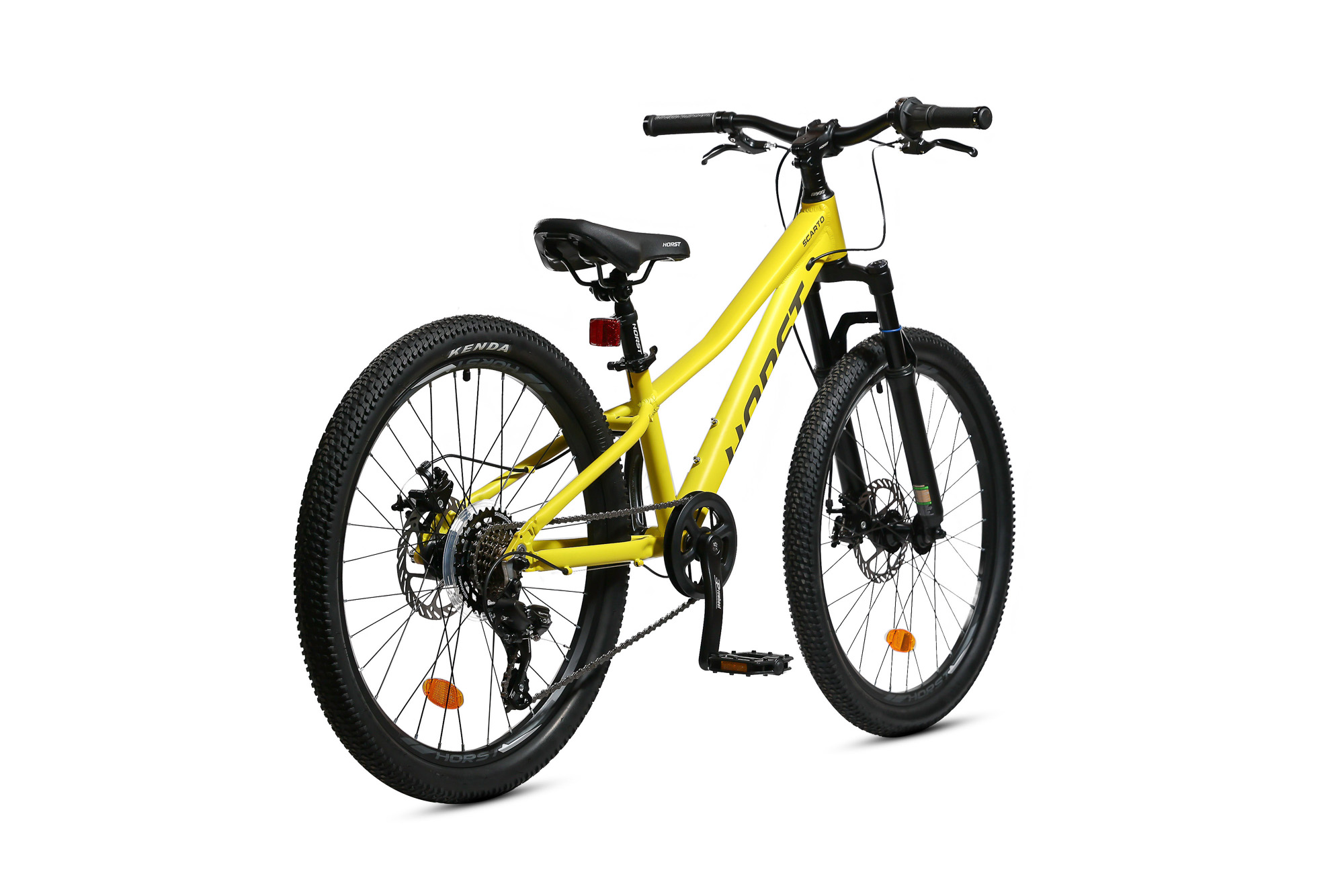 Подростковый горный велосипед Horst Scarto 2026 предназначен для юных катальщиков и спортсменов, предпочитающих несложное катание в городе, в парках и на даче. Легкая алюминиевая рама из сплава 6061, амортизатор для увеличения комфорта и управляемости. 24-дюймовые колеса собраны на прочных двойных ободах и обуты в широкую для такого диаметра колес резину Kenda шириной 2.1 дюйма. Трансмиссия на 7 скоростей – уровня Shimano Tourney. Дисковые механические тормоза Yinxing обеспечивают хорошую мощность торможения в любых дорожных условиях.