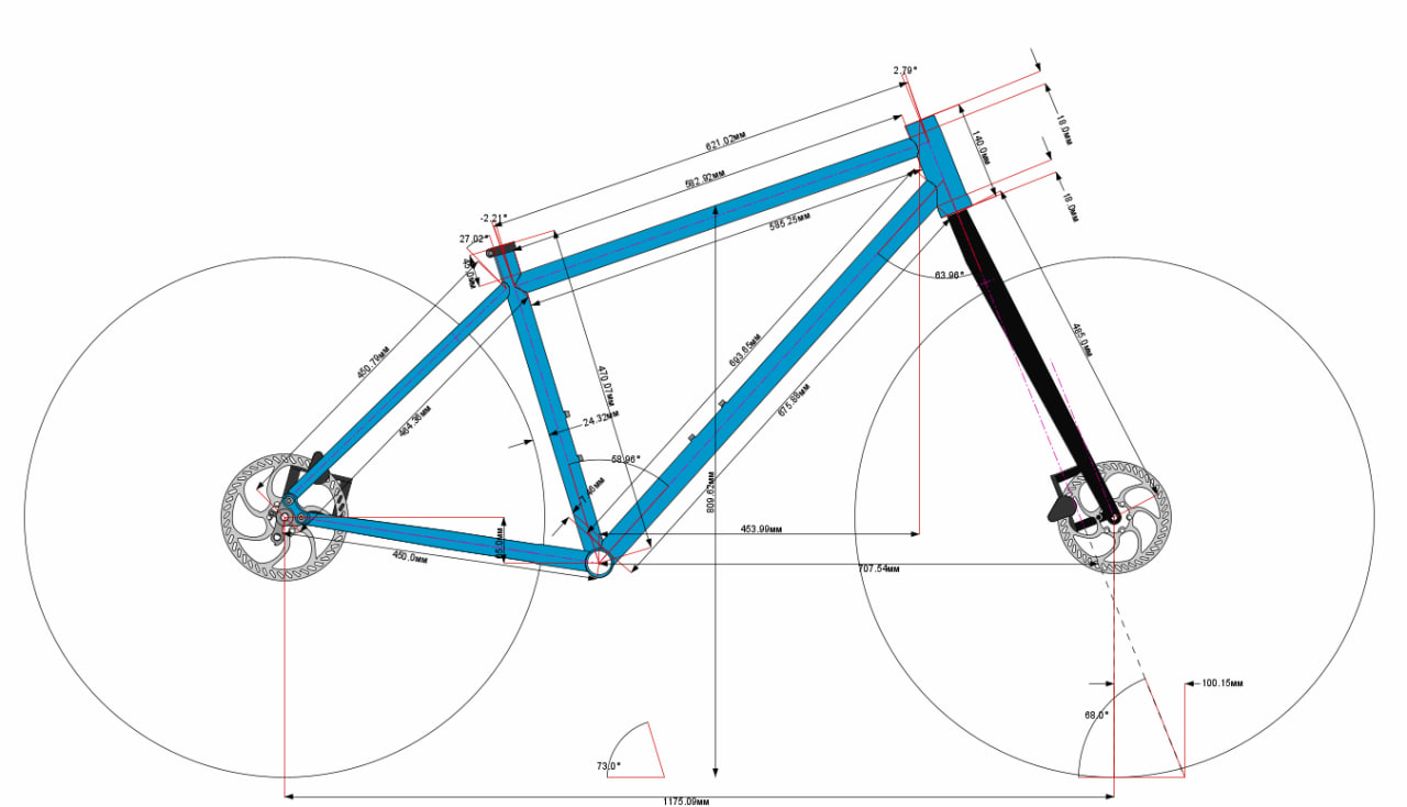 Геометрия рамы размер L: Рич 454 мм Колесная база 1175 мм Угол рулевой колонки 68 градусов Угол подседельной трубы 73 градуса Высота вилки 485 мм Выбег вилки 50 мм Провис каретки 65 мм Длинна перьев 450 мм Высота подседельной трубы 470 мм