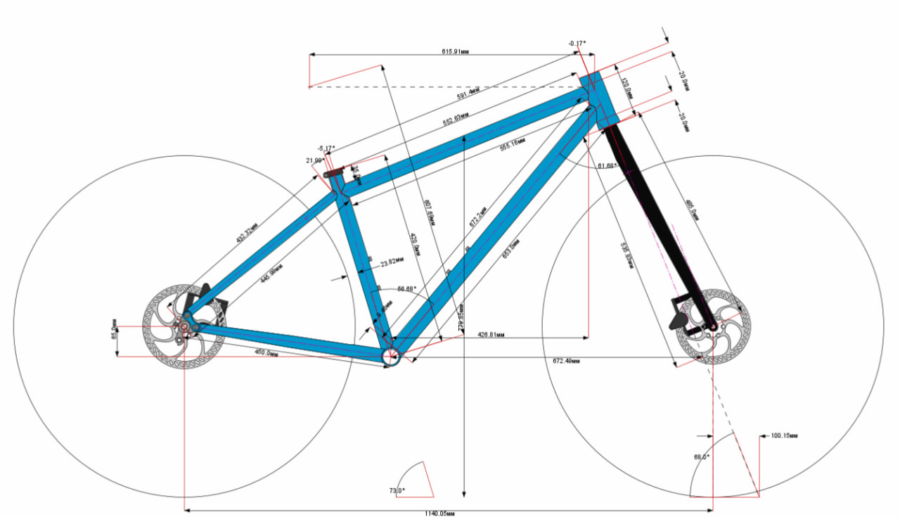 Геометрия рамы размер M: Рич 429 мм Колесная база 1140 мм Угол рулевой колонки 68 градусов Угол подседельной трубы 73 градуса Высота вилки 485 мм Выбег вилки 50 мм Провис каретки 65 мм Длинна перьев 450 мм Высота подседельной трубы 420 мм