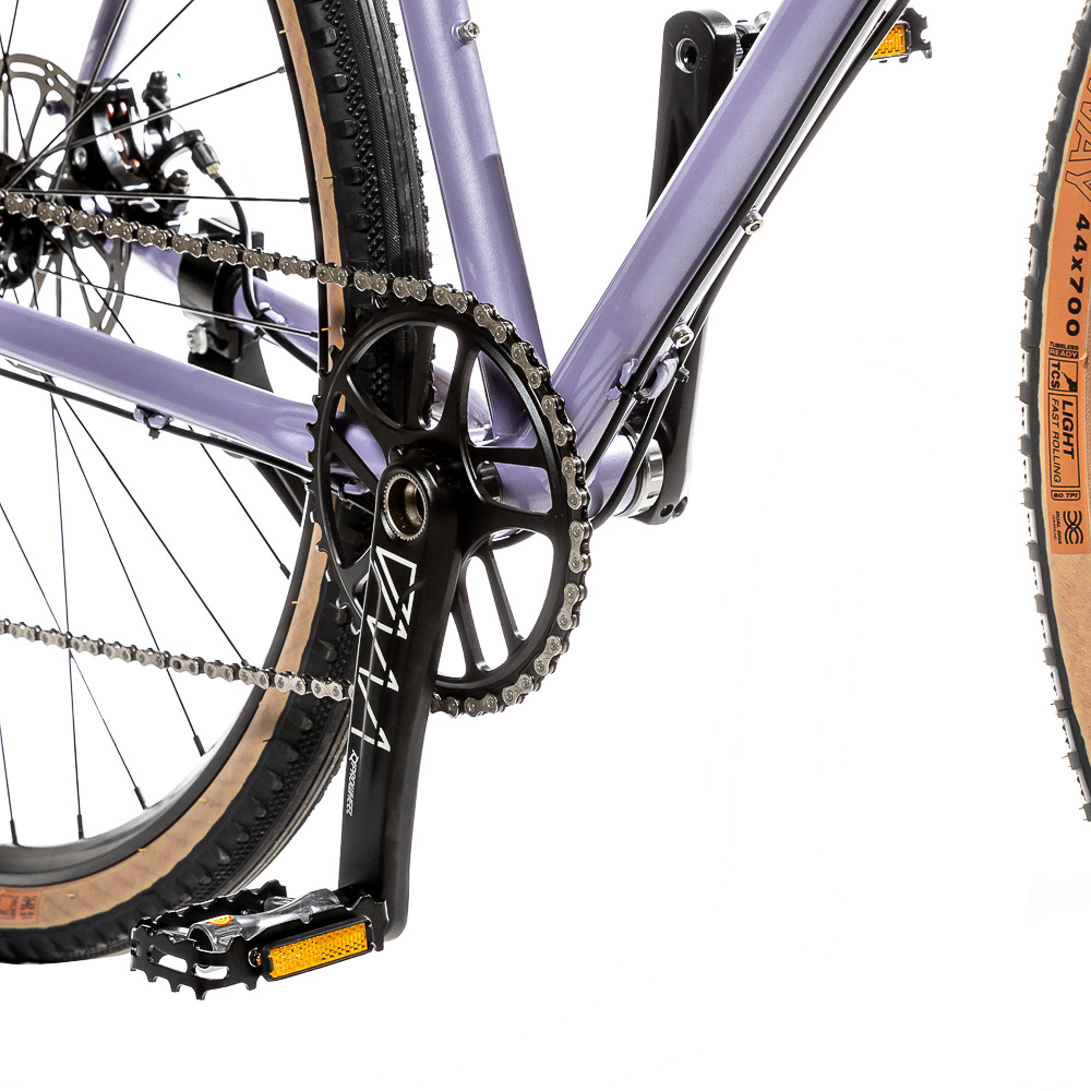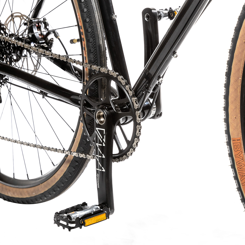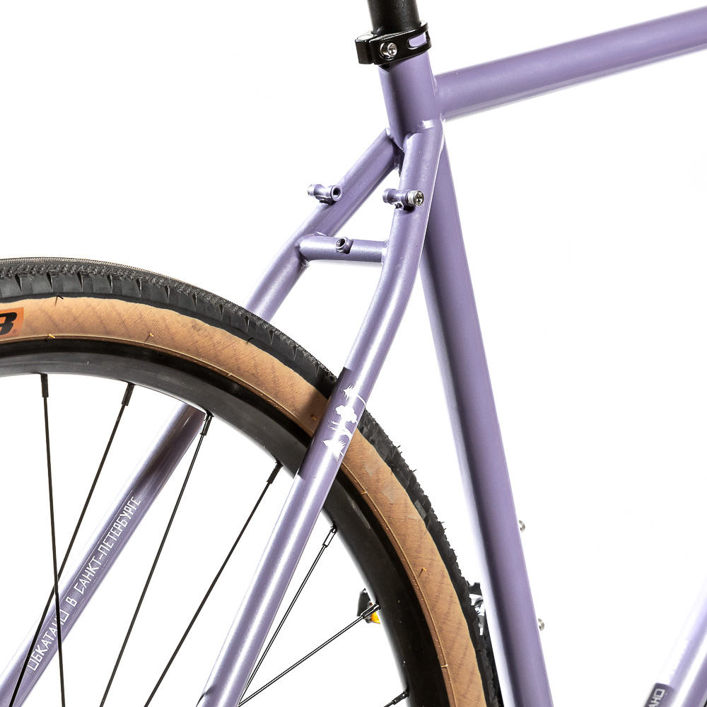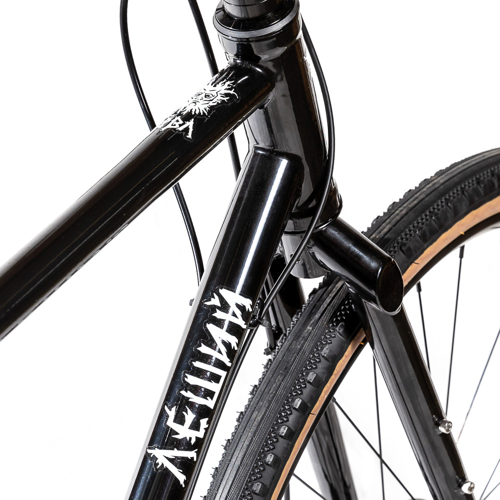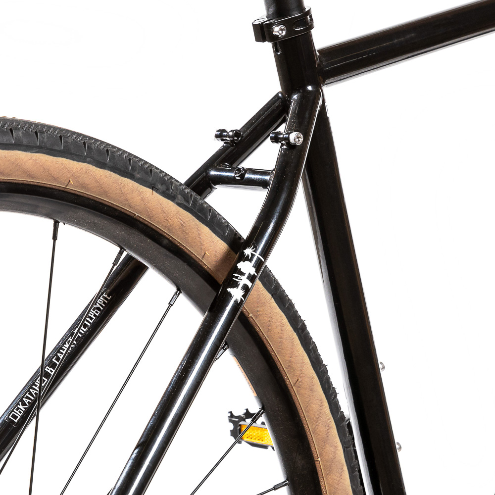 Гравиный велосипед с корнями из горного велосипеда. Чистокровный гравийник всегда ближе к дорожному велосипеду: он тонкий — трубы маленького диаметра, тоненькие и это приводит к снижению прочности и жесткости рамы, а значит к потере наката. Также грвийные рамы на трубах с небольшим диаметром не любят столкновения, что чаще всего приводит к смерти переднего треугольника. С этим мы решили поработать основательно и сделали рамы из смеси гравийных и трюковых труб сплава хромо 4130 с термообработкой. В результате тестов и сравнений мы получили раму с очень жестким кареточным узлом и как следствие ощутимо повысили накат велосипеда. Прочность, жесткость и накат — вот что сразу заметно на Лешем. Размерная сетка представлена в трех вариантах: 52 (S/M), 54 (M/L) и 56 (L/XL). С ростом 183 см оптимально кататься на 54. Рама «большемерит». В 54 и 56 размерах в раму можно поставить покрышки до 2,1 дюйма. В 52 размер 1,8 дюйма из-за более коротких перьев. Передний треугольник сделан из дважды и трижды баттированных кастом труб хромо 4130 с термообработкой, рулевой стакан стандарта zs44, а точнее в сток рама поставляется с рулевой ec44 под шток 1.1/8, а при замене нижней чашки на ex44 устанавливается вилка с коническим штоком. Задний треугольник сделан из труб, которые мы используем для BMX велосипедов и это феноменально улучшает жесткость рамы и ее накат. Есть крепление для переднего переключателя. BSA каретка шириной 73 мм. Подседельная труба имеет диаметр 29,8 мм под штырь 27,2 мм. Дропауты под 142x12 мм со сквозной осью. Сами дропауты мы изобрели, опираясь на опыт клиентов нашей мастерской. Мы просто собрали воедино пазл из обломков дропаутов и рам, которые нам приносят на ремонт и сделали свои дропауты на века. Это 5 мм стальной лист с опорным креплением для съемных, фрезерованных алюминиевых вставок с фиксаторами на двух бонках. Таким образом мы ушли от стыка алюминиевой оси в стальном дропауте, что часто приводит к закисанию оси. Также обилие металла, как на раме, так и на самих дропаутах защищает их от глупых поломок.