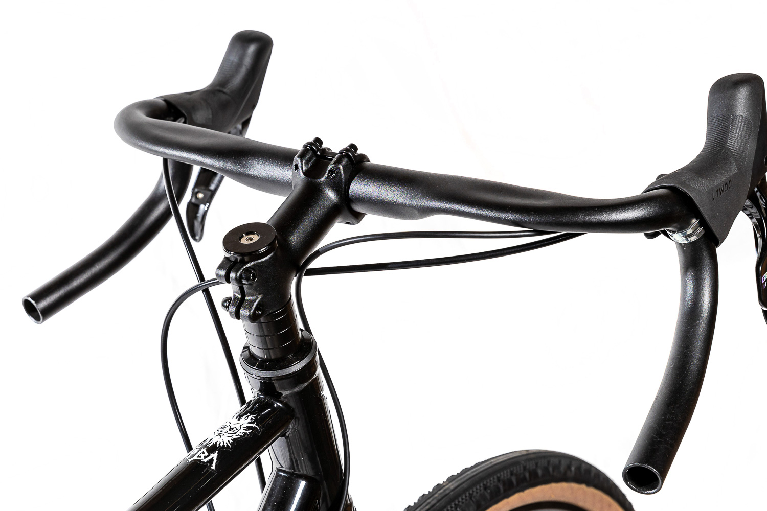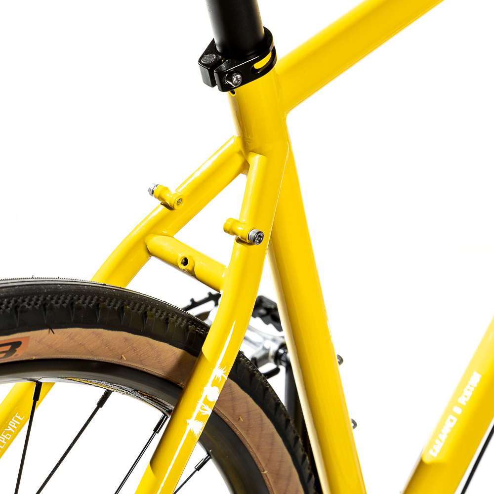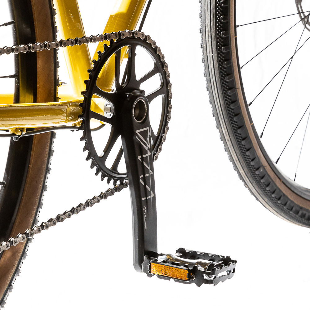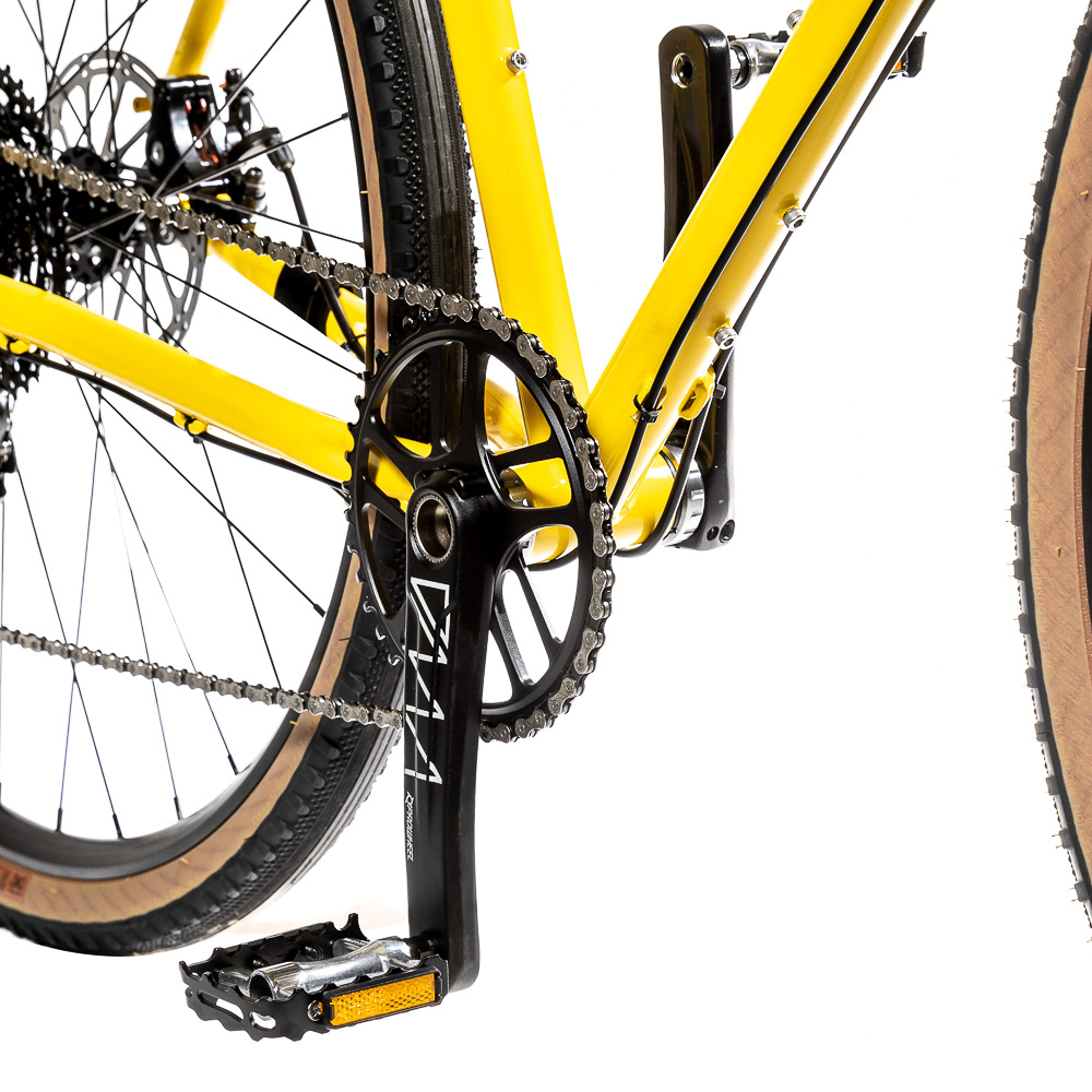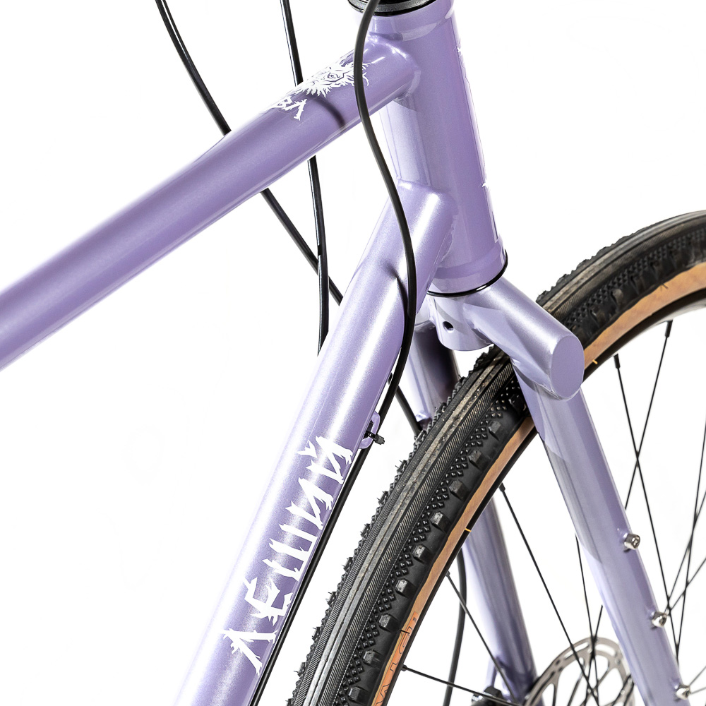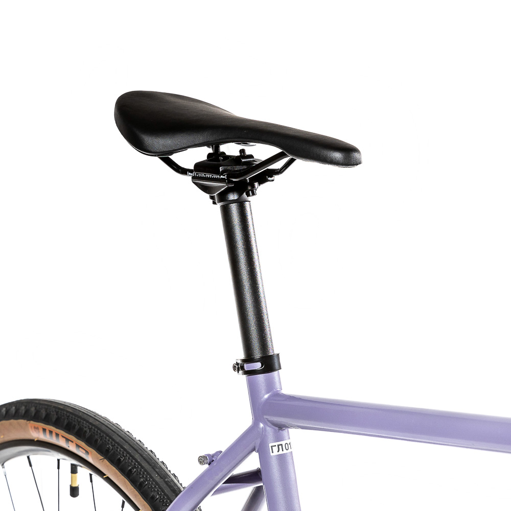 Гравиный велосипед с корнями из горного велосипеда. Чистокровный гравийник всегда ближе к дорожному велосипеду: он тонкий — трубы маленького диаметра, тоненькие и это приводит к снижению прочности и жесткости рамы, а значит к потере наката. Также грвийные рамы на трубах с небольшим диаметром не любят столкновения, что чаще всего приводит к смерти переднего треугольника. С этим мы решили поработать основательно и сделали рамы из смеси гравийных и трюковых труб сплава хромо 4130 с термообработкой. В результате тестов и сравнений мы получили раму с очень жестким кареточным узлом и как следствие ощутимо повысили накат велосипеда. Прочность, жесткость и накат — вот что сразу заметно на Лешем. Размерная сетка представлена в трех вариантах: 52 (S/M), 54 (M/L) и 56 (L/XL). С ростом 183 см оптимально кататься на 54. Рама «большемерит». В 54 и 56 размерах в раму можно поставить покрышки до 2,1 дюйма. В 52 размер 1,8 дюйма из-за более коротких перьев. Передний треугольник сделан из дважды и трижды баттированных кастом труб хромо 4130 с термообработкой, рулевой стакан стандарта zs44, а точнее в сток рама поставляется с рулевой ec44 под шток 1.1/8, а при замене нижней чашки на ex44 устанавливается вилка с коническим штоком. Задний треугольник сделан из труб, которые мы используем для BMX велосипедов и это феноменально улучшает жесткость рамы и ее накат. Есть крепление для переднего переключателя. BSA каретка шириной 73 мм. Подседельная труба имеет диаметр 29,8 мм под штырь 27,2 мм. Дропауты под 142x12 мм со сквозной осью. Сами дропауты мы изобрели, опираясь на опыт клиентов нашей мастерской. Мы просто собрали воедино пазл из обломков дропаутов и рам, которые нам приносят на ремонт и сделали свои дропауты на века. Это 5 мм стальной лист с опорным креплением для съемных, фрезерованных алюминиевых вставок с фиксаторами на двух бонках. Таким образом мы ушли от стыка алюминиевой оси в стальном дропауте, что часто приводит к закисанию оси. Также обилие металла, как на раме, так и на самих дропаутах защищает их от глупых поломок.