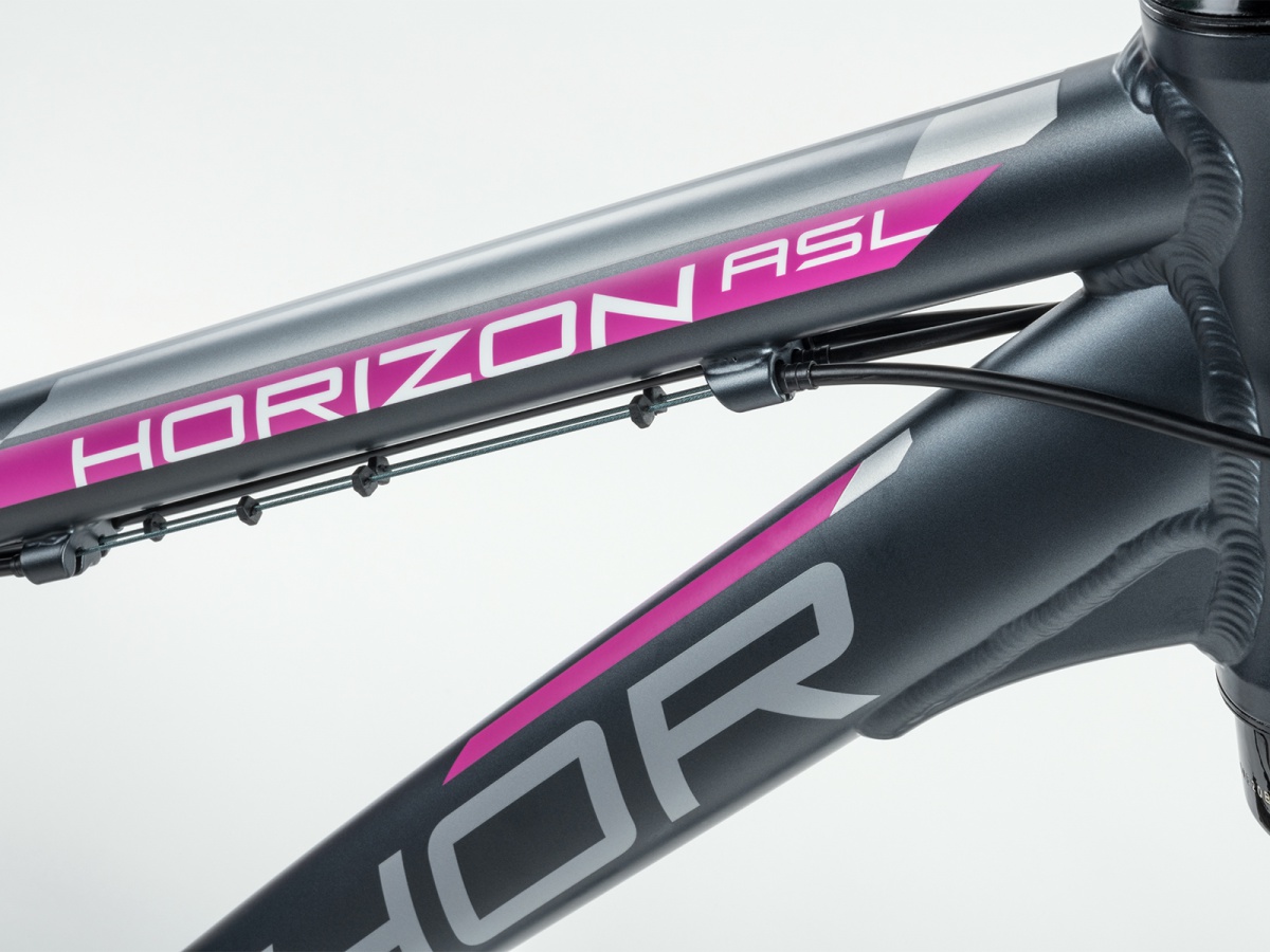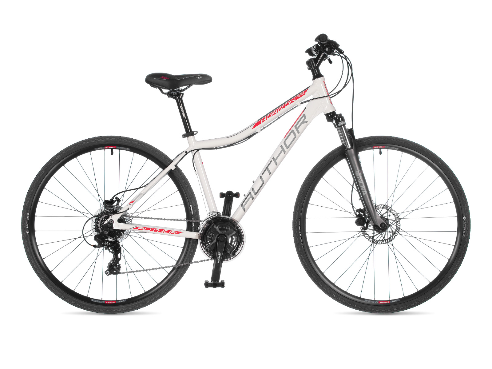Женский гибридный велосипед с дисковыми гидравлическими тормозами Author Horizon ASL – отличный вариант для ежедневных поездок на работу и прогулок по выходным. Велик собран на легкой алюминиевой раме, со специальной женской геометрией, обеспечивающей удобную посадку. Оборудование рассчитано преимущественно на асфальтированные и укатанные грунтовые дороги, но иногда можно проехаться и по легкому бездорожью. За амортизацию отвечает амортизационная вилка с блокировкой RST Nova ML, с ходом 60 мм. Трансмиссия основана на кассете Shimano HG200-8, она гораздо надежнее любых трещеток, которыми обычно комплектуют бюджетные велики. Перекидки передач Shimano Tourney, манетки - Acera. Число передач 3х8. Дисковая гидравлика Tektro отличается повышенной надежностью торможения в любых погодных условиях. Вес байка на 17 ростовке рамы – 14,1 кг.
