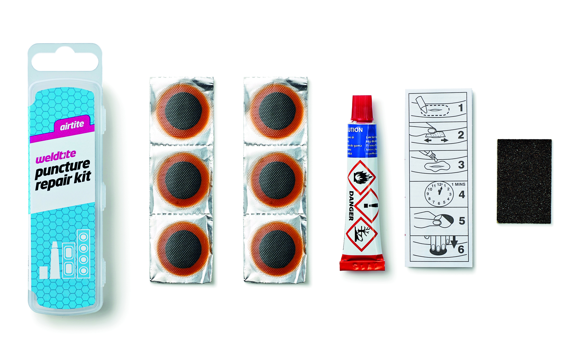 Велосипедная аптечка от компании WELDTITE для ремонта проколов колес. В состав аптечки входят 2 трехслойных суперзаплатки овальной формы размером 28х18 мм, 4 заплатки диаметром 20 мм, клей, шкурка для зачистки места прокола на камере.